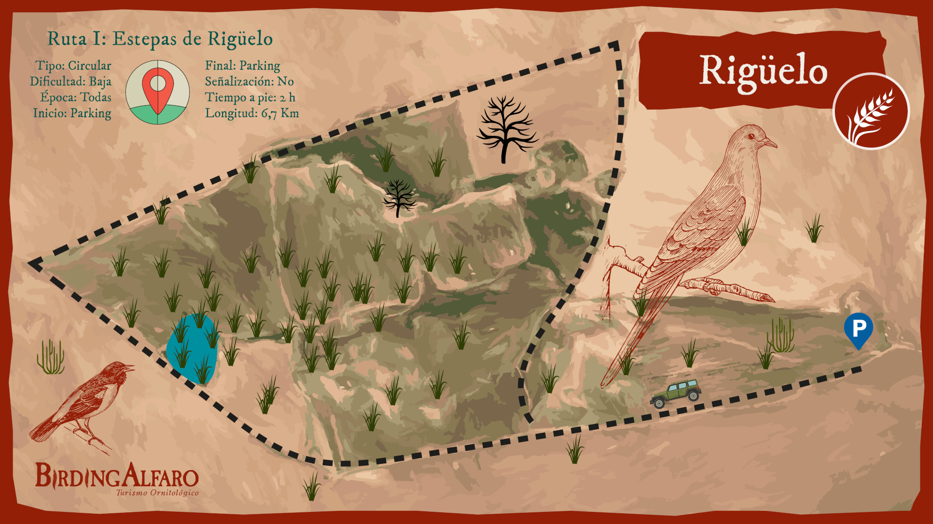 El transecto que te proponemos en esta ruta es una vuelta de unos 7 km en la cual recorreremos una de las últimas zonas esteparias de La Rioja. Durante el recorrido atravesaremos zonas de viñedos y cultivos de secano intercalados con algunos terrenos silvestres. La ruta tiene como inicio y fin de senda el aparcamiento habilitado para coches que está situado en las proximidades de la nave con la que nos encontramos nada más subir a Rihuelo. La primera parte del recorrido discurre por una larga recta en la que, paseando entre diferentes tipos de cultivos, nos podremos empezar a hacer una idea de las características y excepcionalidad que poseen este tipo de hábitats. Llegaremos a un cruce de varios caminos, nosotros debemos ir por el que dejando a mano izquierda unas viñas y a la derecha la nave de una bodega nos llevará hasta la “Balsa de Portil de Lobos”. Teniendo en cuenta los largos períodos de sequía que hay en esta zona, sobre todo en época estival, estas balsas de regadío son muy importantes para la fauna, siendo lugar de encuentro de multitud de especies que a lo largo del día hacen acopio del valioso líquido. Una vez sobrepasada la balsa de riego llegaremos a un cruce donde deberemos coger el camino de la derecha y que, cogiendo un poco de altura al principio para luego descender la colina, nos llevará por una mezcla de diferentes usos del terreno que otorgan a esta zona una singular belleza. Una vez nos encontremos en la parte baja solo tendremos que volver a ascender por el camino que queda a nuestra derecha en el cruce para volver a retomar la recta que, en sentido contrario al anterior, nos llevará de nuevo al punto de partida.